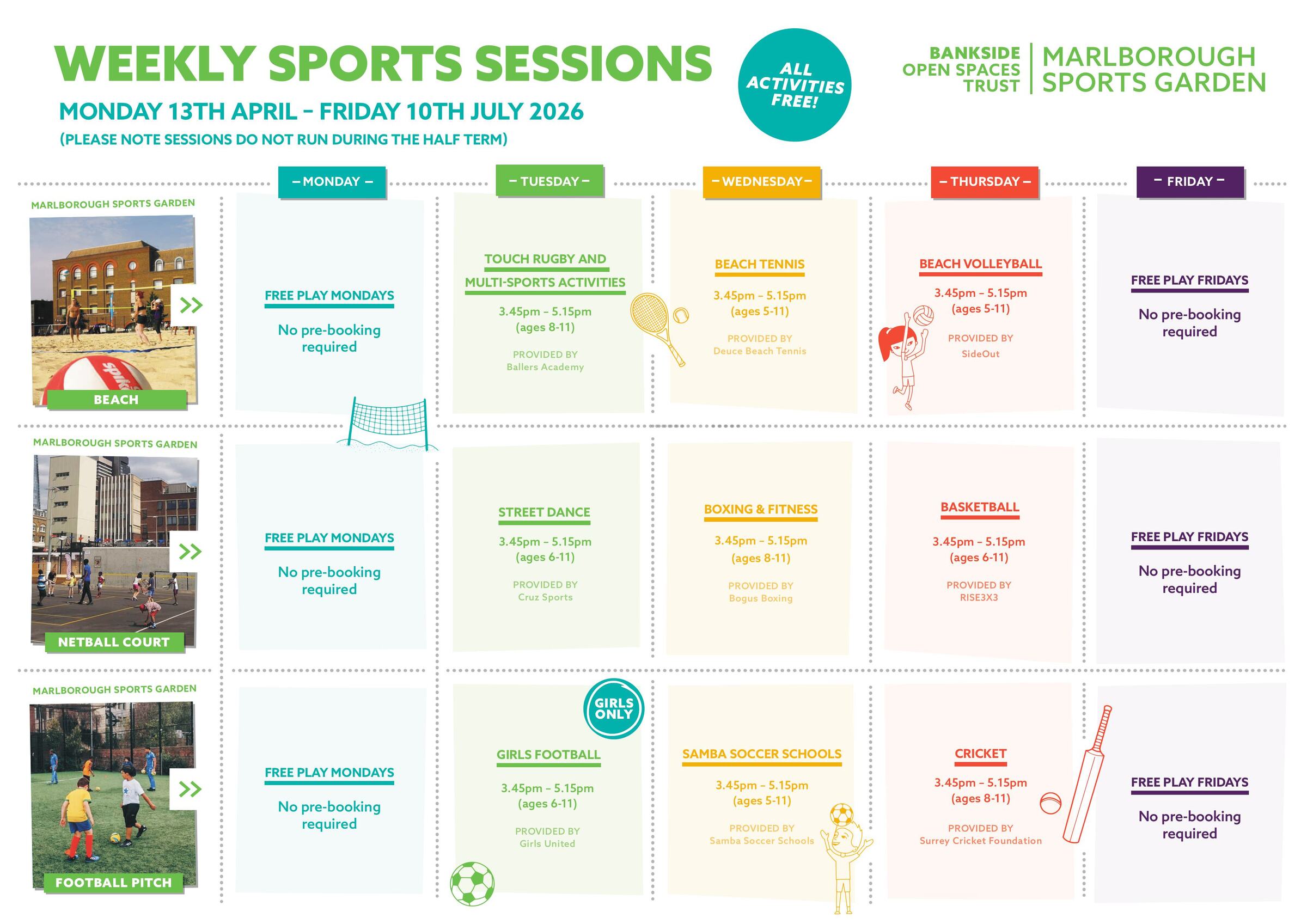 FREE, fun and active afterschool sports sessions for children and young people run from Tuesday to Thursday at Marlborough Sports Garden all through the autumn term. There’s something for everyone throughout the week!