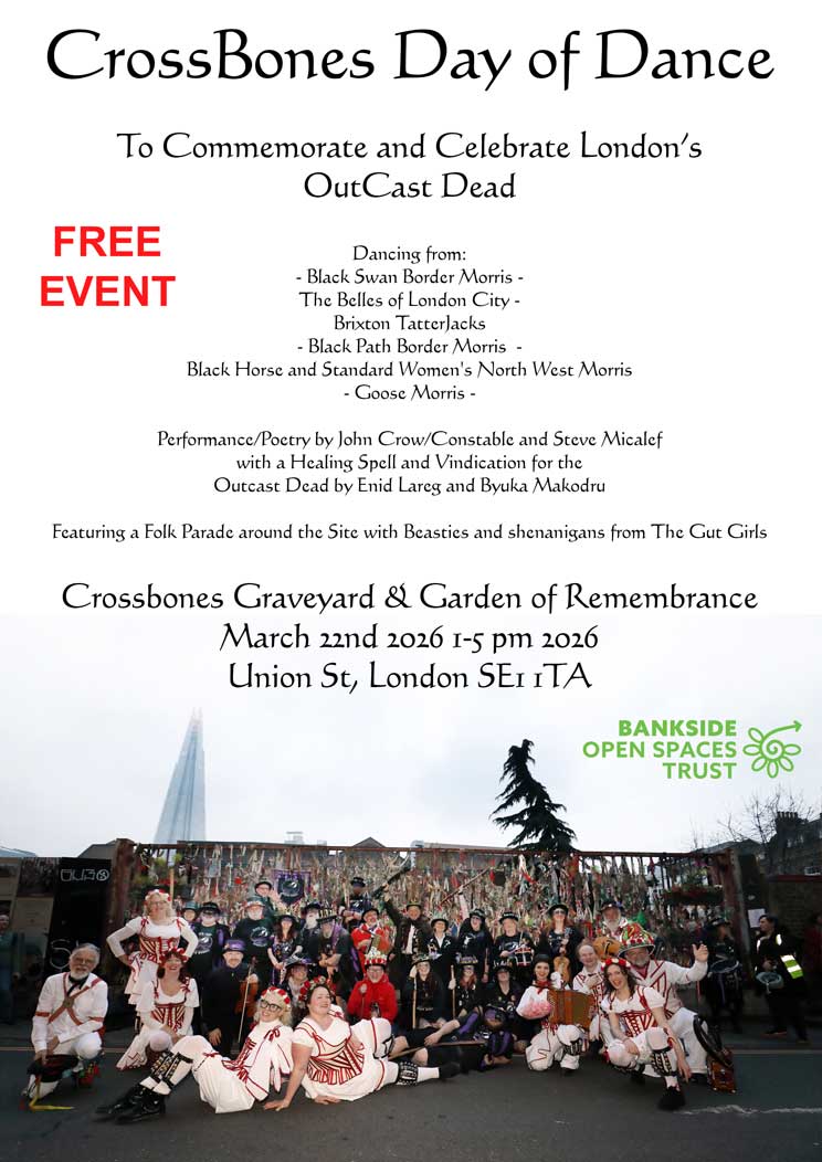 image advertsiing the Crossbones day of dance. There are Morris dancers posing for the picture, and the text reads: Crossbones Day of Dance, 22nd March 2026, 1pm - 5pm